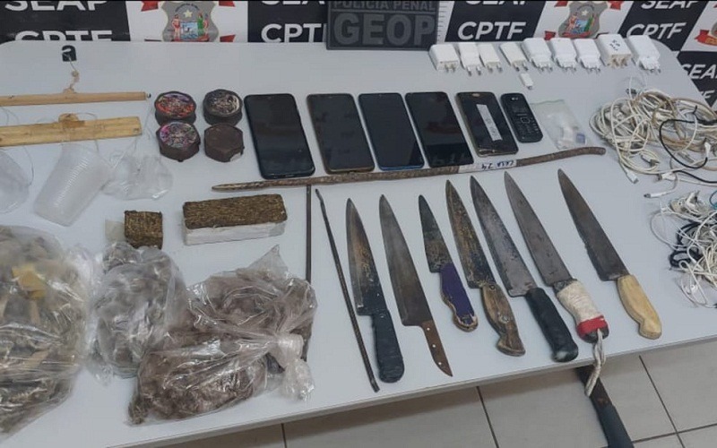 Quatro celulares, um quilo de drogas e 11 armas brancas foram apreendidos nesta terça-feira, 28 de novembro, no Conjunto Penal de Teixeira de Freitas. Do total de armas encontradas, seis eram facas, quatro chunchos e um vergalhão.