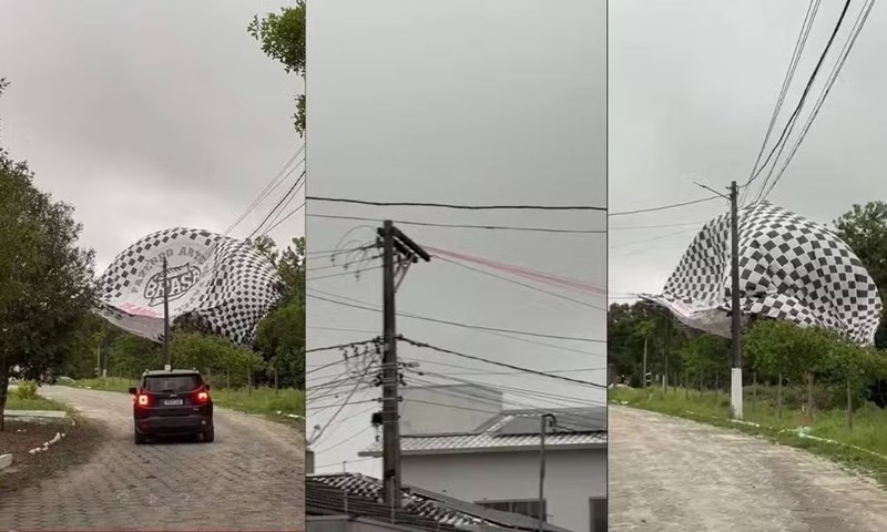 Imagens registradas por moradores mostram o momento em que o balão se enrosca na rede elétrica e atinge árvores e telhados. A cena chamou atenção dos vizinhos, que acompanharam a ação das equipes de resgate.