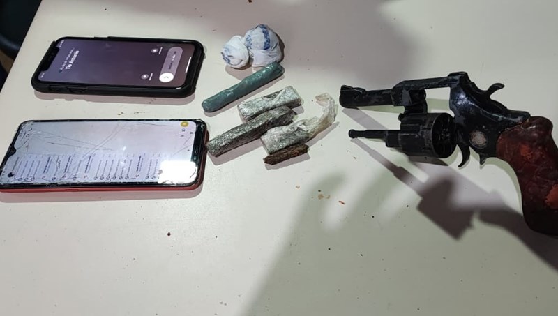 Pouco depois, a moto foi interceptada e o casal abordado. Aos policiais, os suspeitos confessaram ter dispensado uma arma de fogo e uma quantidade de droga. A equipe realizou uma varredura na área indicada e encontrou a embalagem, que continha um revólver calibre .32, marca Rossi, e cerca de 39 gramas de maconha.
