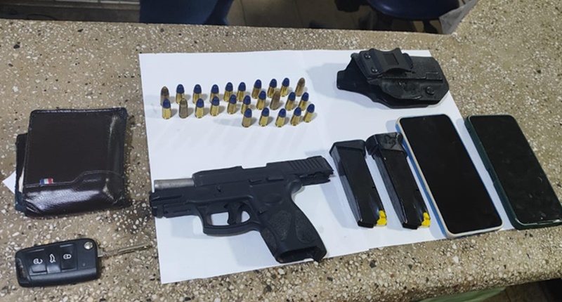 Durante a abordagem, nada de ilícito foi encontrado com os ocupantes. Contudo, na busca veicular, os policiais localizaram uma pistola Taurus, modelo G2C, calibre 9mm, de uso restrito. A arma estava municiada e acompanhada de dois carregadores da mesma marca, além de 25 munições do mesmo calibre. Também foram apreendidos dois celulares e o veículo utilizado pelos suspeitos.