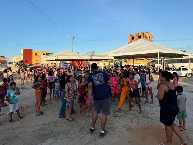 A celebração aconteceu no espaço da Rua Sucupira, ao lado da Igreja Deus é Amor, que se transformou em um verdadeiro ponto de encontro de sorrisos e brincadeiras. A programação contou com pipoca, algodão-doce, brincadeiras, música e muita animação, garantindo momentos inesquecíveis para as crianças do bairro.