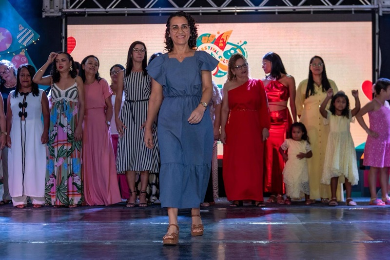 A noite começou com uma apresentação de dança, seguida por uma intervenção artística que combinou língua de sinais (Libras) e recitação de cordel, ressaltando a importância da acessibilidade e da tradição nordestina dentro do Festival. Logo depois, a programação seguiu com um desfile de corte e costura, no qual peças confeccionadas por alunas das Casas de Cultura foram apresentadas ao público.