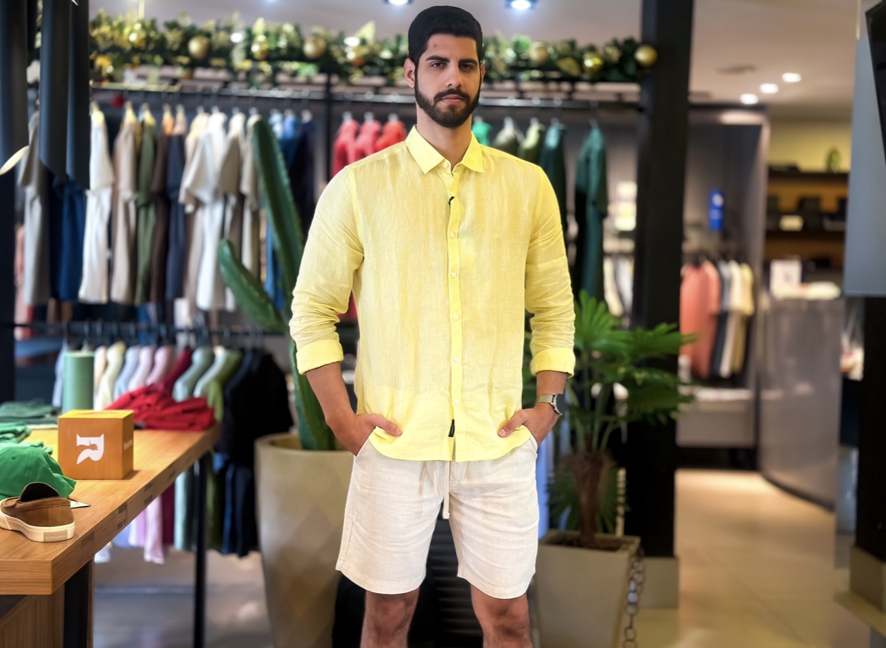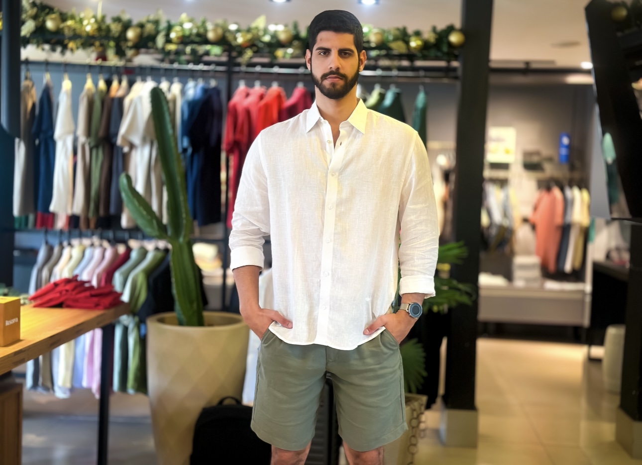 Tecidos leves ganham protagonismo nas coleções de fim de ano, com destaque para o linho, que combina sofisticação e frescor, ideal para as altas temperaturas típicas da estação. Camisas claras, camisetas lisas e polos em tons suaves ajudam a compor visuais elegantes sem excessos, respeitando o clima festivo do Réveillon e a simbologia das cores tradicionais.