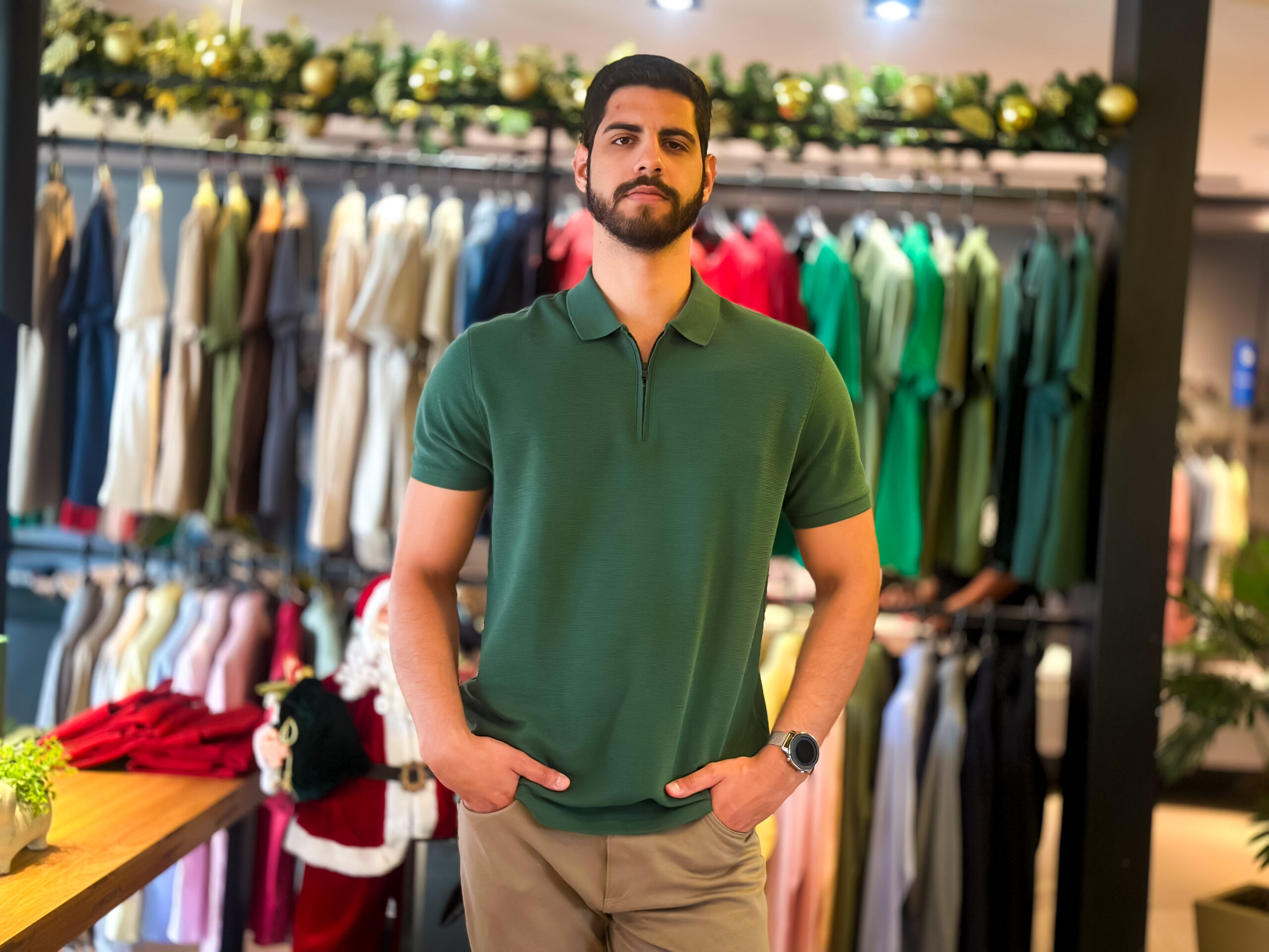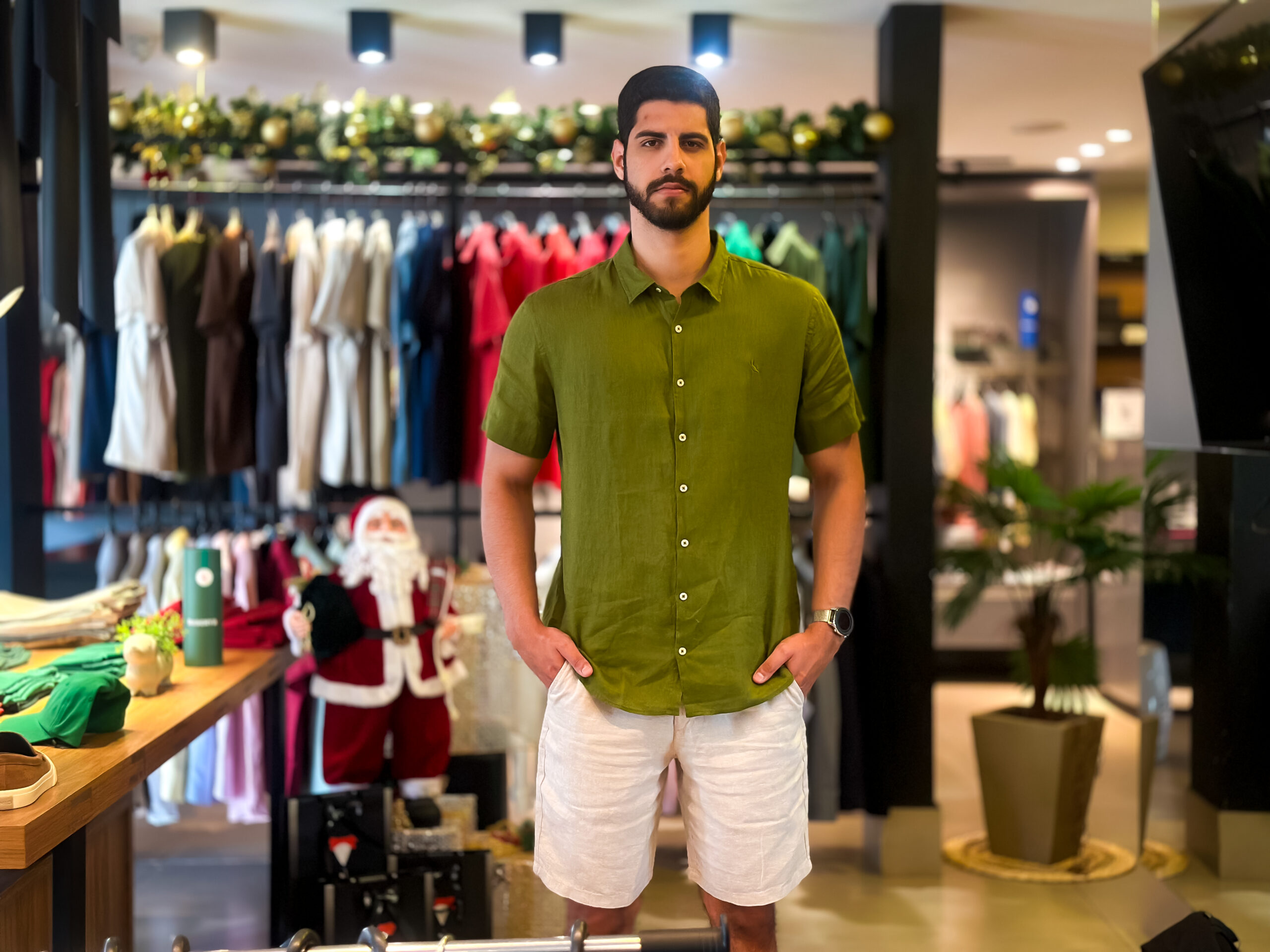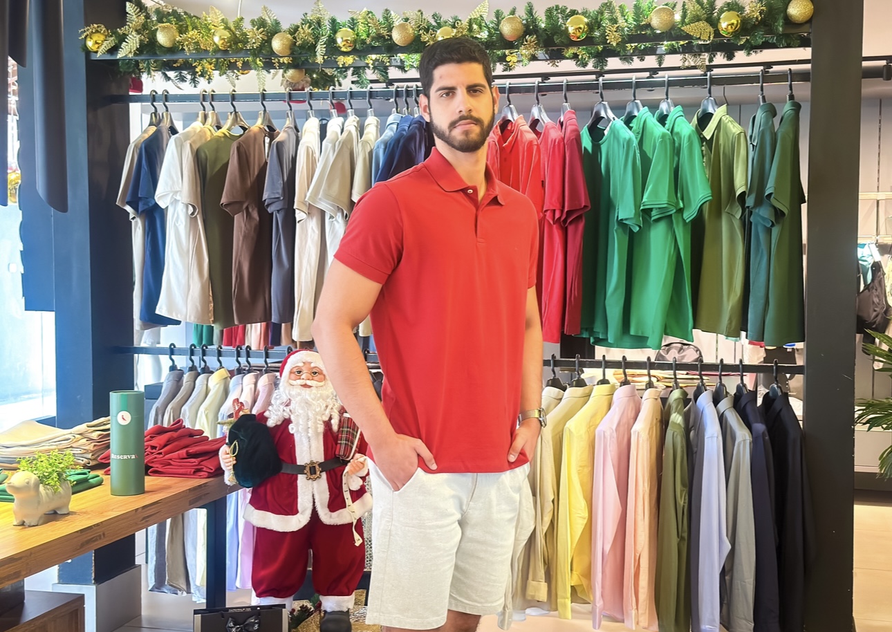As cores clássicas do Natal ganham destaque nas araras, com tons claros, neutros e suaves que transmitem leveza e sofisticação. Tecidos como o linho aparecem como protagonistas da estação, ideais para quem busca frescor e um visual refinado, especialmente em ambientes mais descontraídos. Já as camisetas polo seguem como apostas certeiras, equilibrando informalidade e elegância na medida certa.