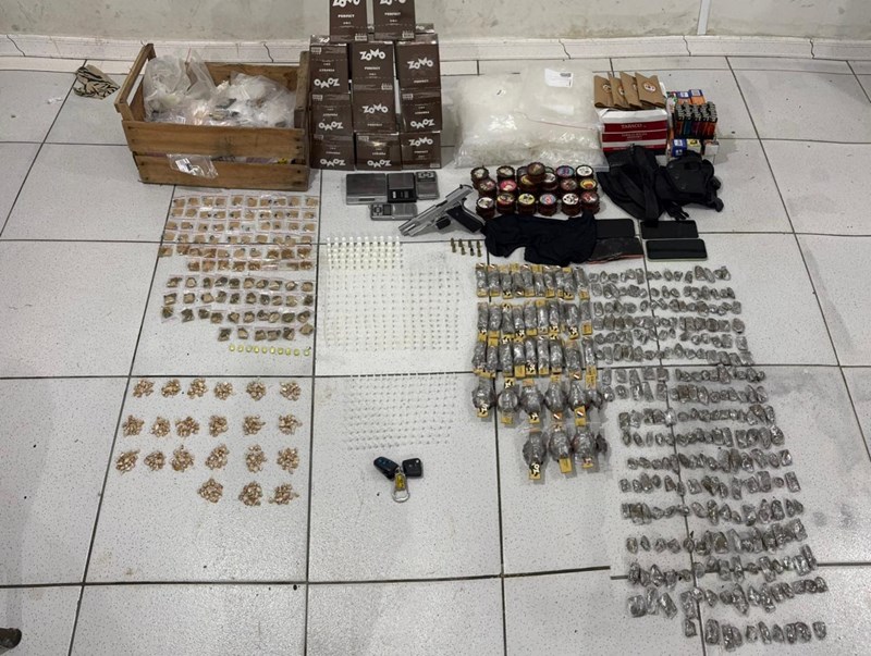Durante a varredura na casa, os policiais encontraram outros três indivíduos e apreenderam grande quantidade de entorpecentes e materiais usados no tráfico.