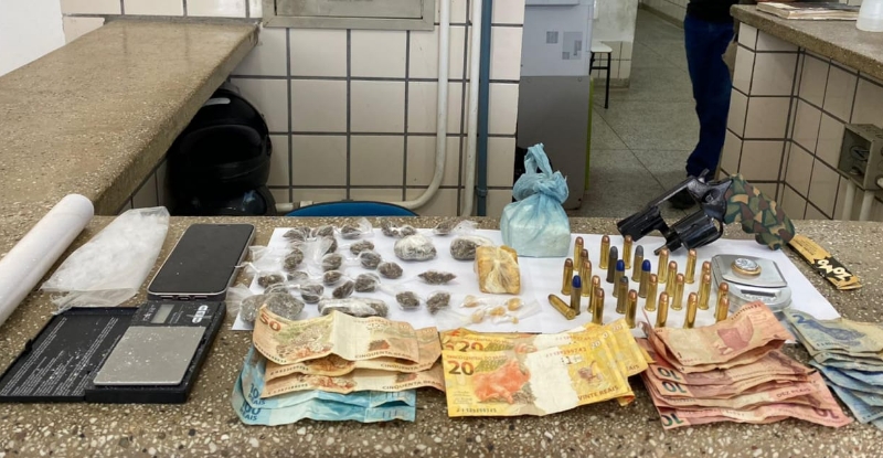 Entre os materiais apreendidos, destacam-se um revólver Taurus calibre .38, com numeração LK49550, acompanhado por 27 munições do mesmo calibre. Além disso, foram apreendidas 70 gramas de maconha, 170 gramas de cocaína, 55 gramas de crack, e diversos materiais utilizados para embalar os entorpecentes.