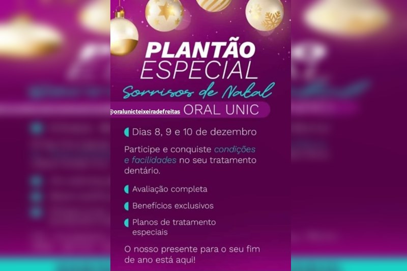 Entre os dias 8, 9 e 10 de dezembro a Oral Unic estará promovendo um plantão especial para você garantir o seu sorriso de Natal.