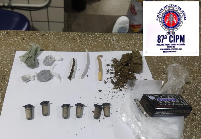 Policiais da 87ª Companhia Independente de Polícia Militar apreenderam seis porções de cocaína e 26 gramas de maconha, na noite deste domingo, 19 de fevereiro, na Rua Cruz das Almas, no Bairro Liberdade II, na cidade de Teixeira de Freitas.
