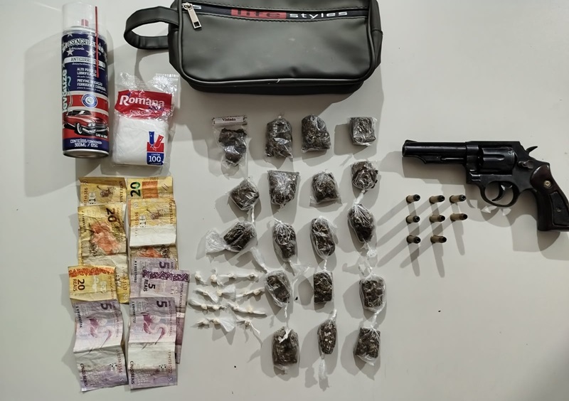 Durante a vistoria no imóvel apontado pelo suspeito, foram localizados um revólver calibre .38 com numeração suprimida, munições, porções de maconha e crack, dinheiro fracionado e materiais comumente utilizados para embalar drogas.