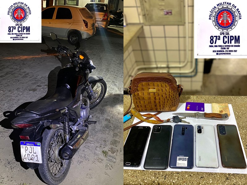 Durante a abordagem, os policiais realizaram uma busca pessoal, resultando na descoberta de cinco celulares, uma bolsa contendo documentos, um canivete e a quantia de R$ 52. Questionados sobre a procedência dos itens, os suspeitos admitiram que os aparelhos celulares e a bolsa foram roubados de moradores que passavam pelas ruas da cidade.