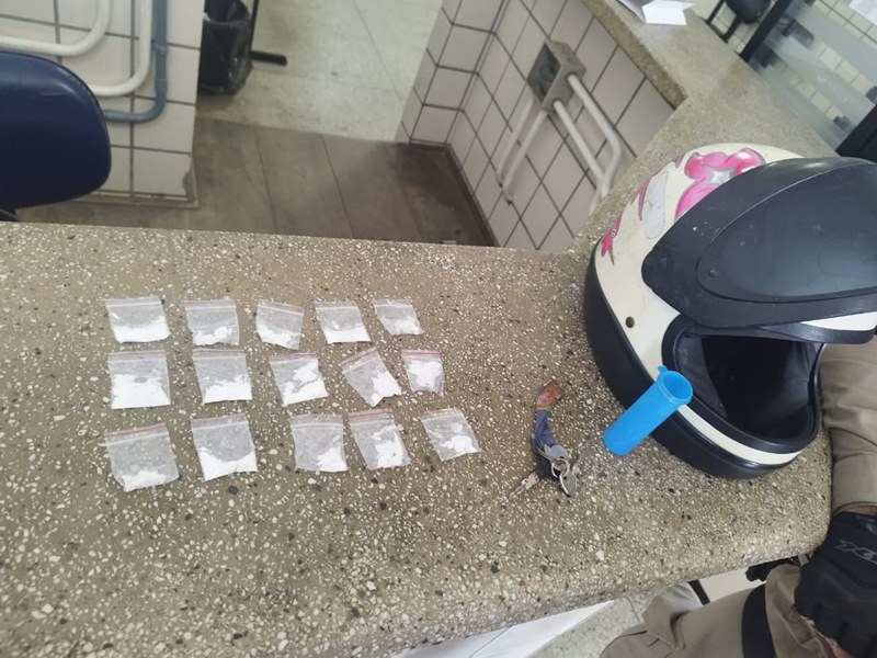 Foram apreendidos 15 porções de cocaína e uma motocicleta Honda Titan Mix CG 150, cor preta, placa OKM-5J52. O material e o suspeito foram apresentados na Delegacia de Polícia.