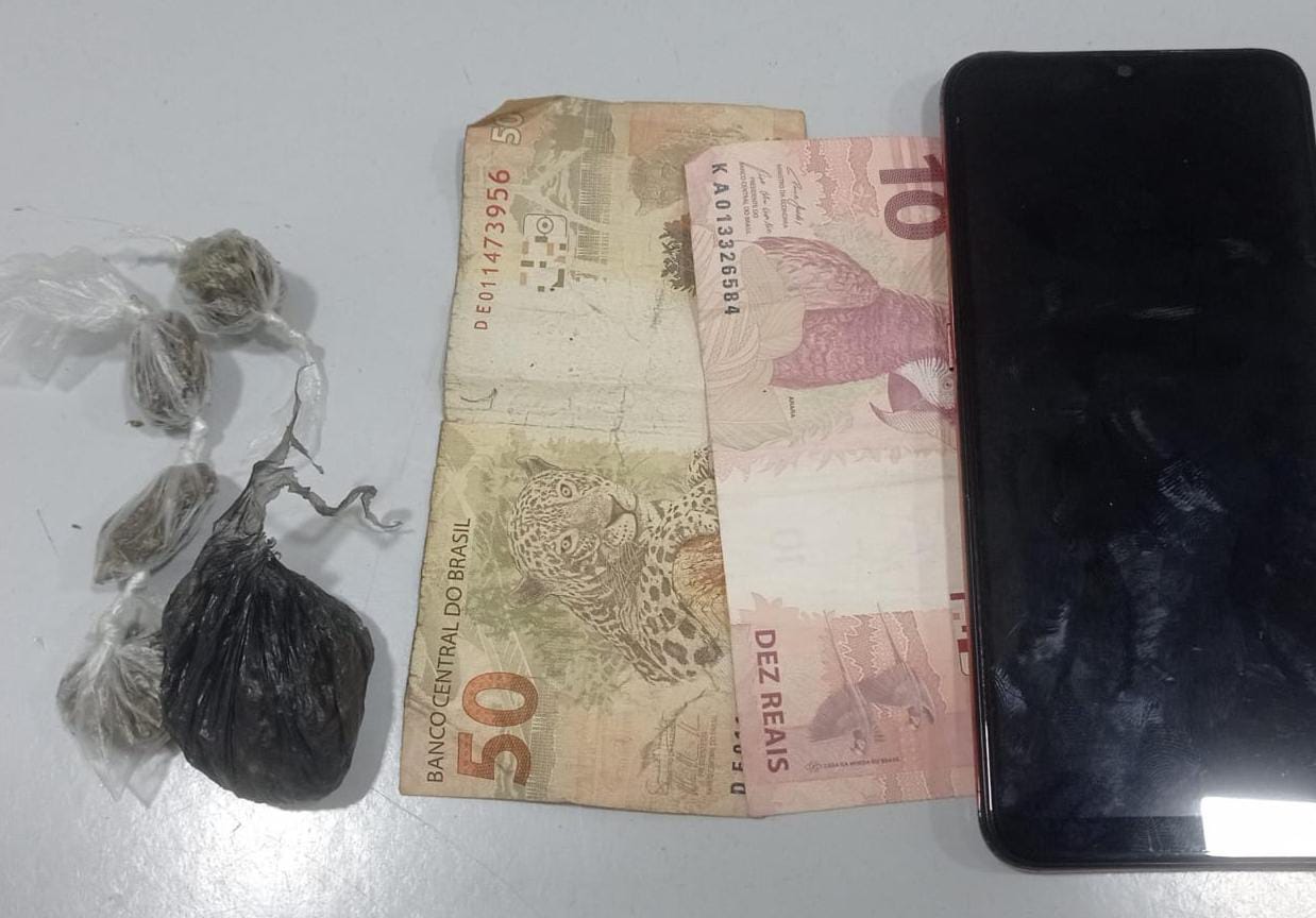 Durante a busca pessoal a PM apreendeu 4 papelotes de maconha, uma porção da mesma droga, pesando 7 gramas, um celular de marca Motorola, de cor rosa, e R$ 60.