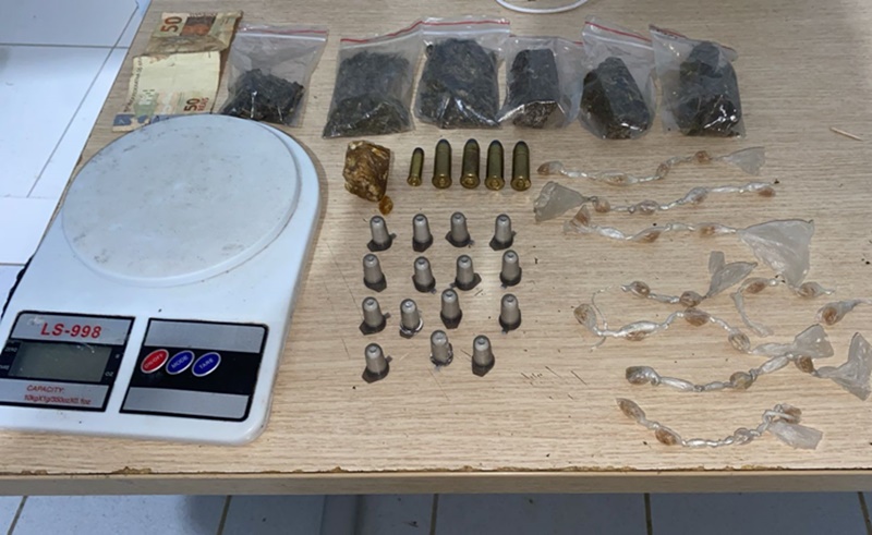 Com ele foram encontrados dois papelotes de maconha e, durante a busca pessoal, dois pinos de cocaína no bolso do short. Questionado, indicou que havia mais materiais ilícitos dentro da casa. No interior da residência foram localizados o restante da droga, munições calibres .44 e .38, uma balança de precisão e R$ 50,00 em espécie.