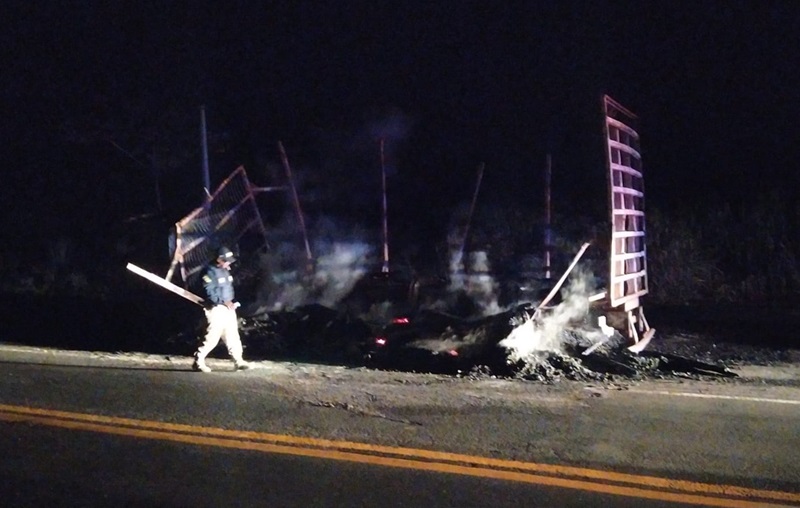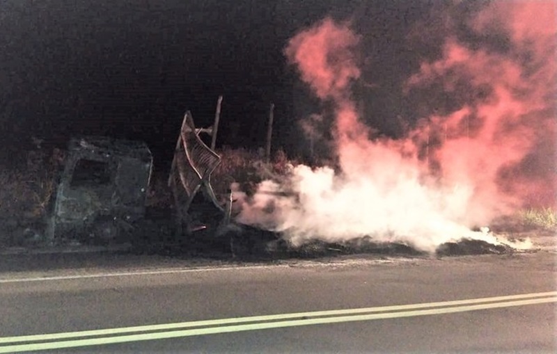 Por volta das 22h18, uma equipe da PRF foi informada de um acidente envolvendo um caminhão. De imediato, os policiais se deslocaram para o local e visualizaram a carreta completamente consumida pelo fogo.