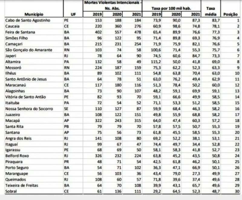 Os dados são do Anuário 2022, do Fórum Brasileiro de Segurança Pública, divulgado na terça-feira, 28 de junho, e têm como base os casos de mortes violentas registrados entre os anos de 2019 e 2021, usando como referência o índice de mortes a cada 100 mil habitantes.
