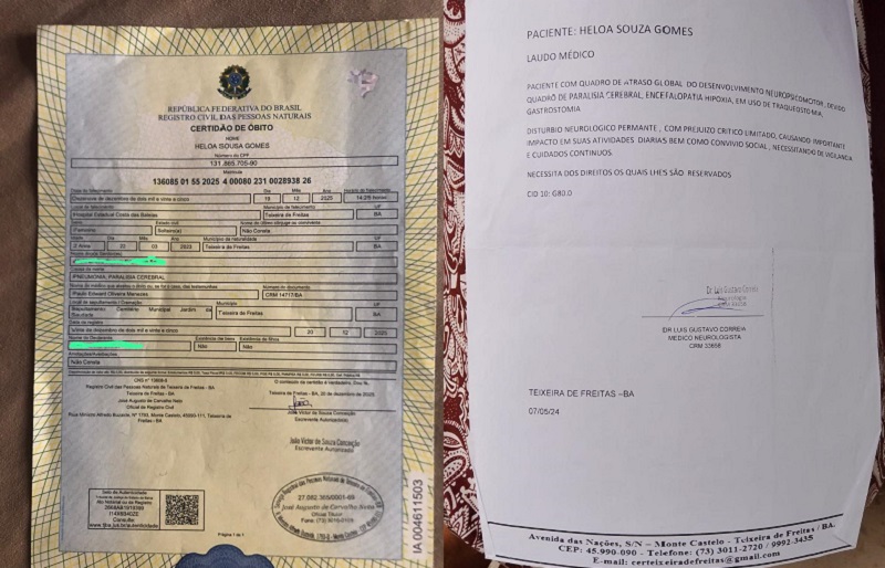 A menina Heloá faleceu no último dia 19, no Hospital Estadual Costa das Baleias (HECB), com quadro de desnutrição severa. As autoridades acionaram o Conselho Tutelar e o IML, que realizará a necropsia. A Polícia Civil investiga as circunstâncias da morte. A versão apresentada pela família, no entanto, coloca em perspectiva as condições médicas pré-existentes extremamente complexas da criança.