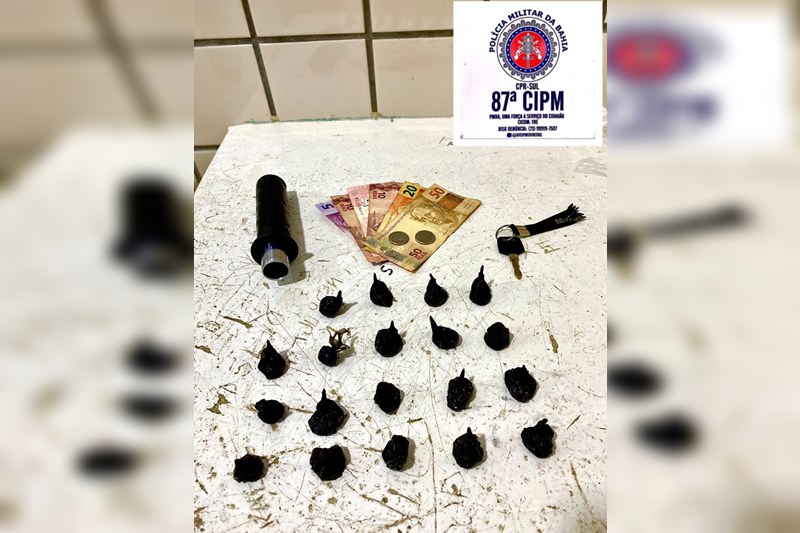 Policiais da 87ª Companhia Independente de Polícia Militar prenderam um homem no início da noite deste domingo, 8 de janeiro, com 19 papelotes de cocaína, na cidade de Teixeira de Freitas. Ele ainda estava com R$ 100, que foi apreendido.