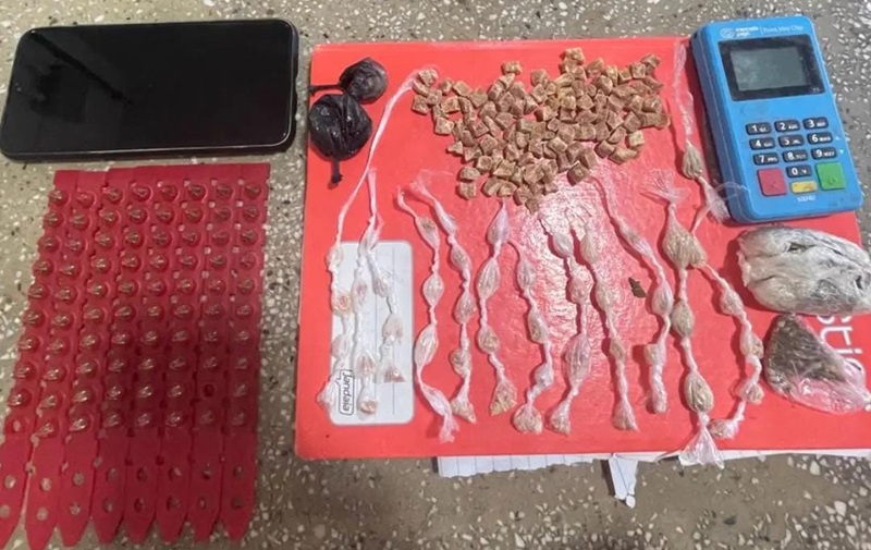 Entre o material apreendido, encontravam-se 150 pedras de crack, totalizando 36 gramas, 5 gramas de cocaína, 15 gramas de maconha, 80 fincapinos e uma maquininha de cartão de crédito.