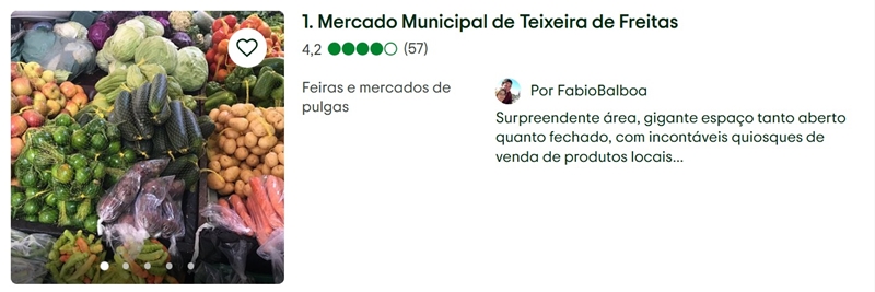 Entre os locais mais bem avaliados está o Mercado Municipal de Teixeira de Freitas, considerado um dos principais símbolos da cultura local. O espaço chama atenção pela grande estrutura e pela variedade de produtos regionais, reunindo quiosques, feirantes e comerciantes que movimentam diariamente a economia da cidade. Em sua avaliação, a turista Fabiana Balboa descreveu o mercado como uma “surpreendente área, gigante espaço tanto aberto quanto fechado, com incontáveis quiosques de venda de produtos locais”.