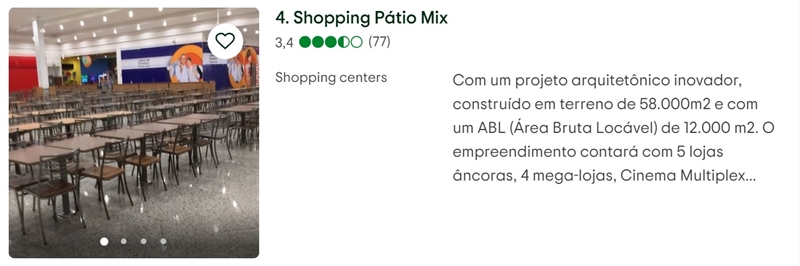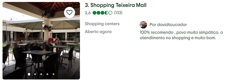 Na mesma linha, o Shopping Pátio Mix integra a lista dos cinco melhores pontos turísticos, sendo citado por visitantes como um espaço que reúne opções variadas de lojas, serviços e praça de alimentação, além de funcionar como um importante ponto de convivência social na cidade.